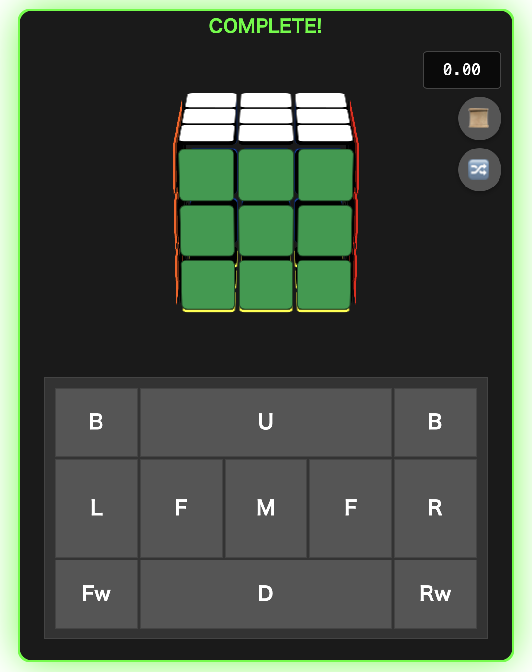 バーチャルキューブ スマホ操作用 2026.01.212026.02.07 0.00 📜 🔀 SOLVE RECORDS Close Recent Best 10 Clear all data B U B L F M F R Fw D Rw