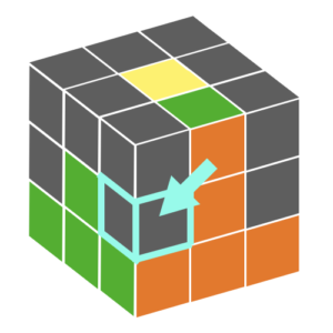 まずは黄色センターを上に向けて持って、上の段から黄色を含んでいないエッジを1つ見つけましょう。(黄色を含んでいるエッジは真ん中の段には揃いません)