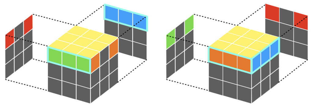 黄色面の側面を見渡すと、「3つ揃っている側面がないパターン」と「3つ揃っている側面があるパターン」があります。